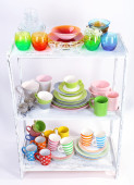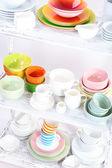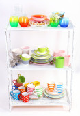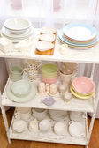 różne naczynia na półce, na białym tle