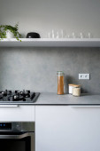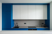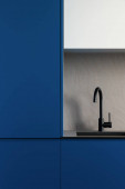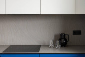 Stylowy czarny dzbanek z dwoma szklankami na nowoczesnym, szarym blatu kuchennym w nowej kuchni z niebiesko-białymi szafkami