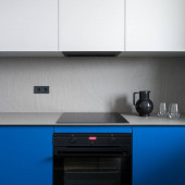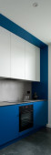 Zdjęcie "Stylowy czarny dzbanek z dwoma szklankami na nowoczesnym, szarym blatu kuchennym w nowej kuchni z niebiesko-białymi szafkami" może być wykorzystywane do celów osobistych i komercyjnych zgodnie z warunkami zakupionej licencji Royalty-free. Obraz jest dostępny do pobrania w jakości wysokiej rozdzielczości do 5760x3840.
