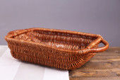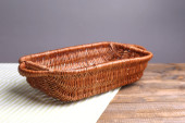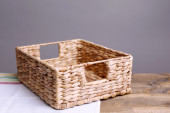 pusty wiklinowy koszyk na drewnianym stole, na ciemnym tle
