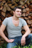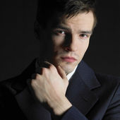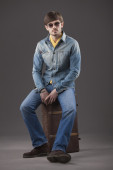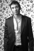 portret moda mężczyzna - pół twarzy w cieniu na szarym tle