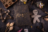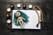Kobieta lalka voodoo ze szpilkami otoczona uroczystymi przedmiotami na czarnym drewnianym tle, płaska leżała