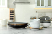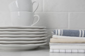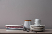 Stos miękkich ręczników kuchennych i naczyń na drewnianym stole na szarym tle