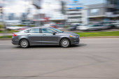 Ukraina, Kijów - 27 czerwca 2021 r.: samochód Black Ford Fusion (Ameryka Północna) poruszający się po ulicy.