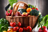świeżych organicznych warzyw w wiklinowym koszu w ogrodzie