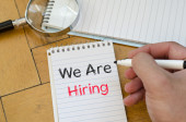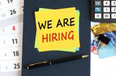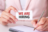 Zatrudnienie jest napisane na białej wizytówce w ręce kobiety. Niebieskie tło. Koncepcja działalności gospodarczej i reklamy