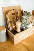 szczegóły kuchni, akcesoria, ceramiczne słoiki, drewniany stół