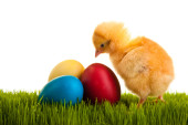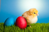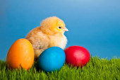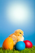 Pisanki i kurcząt na zielonej trawie na niebieskim tle