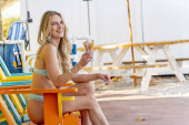 Wspaniała brunetka model bikini cieszy się lodami podczas relaksu w wiosennej pogodzie