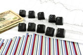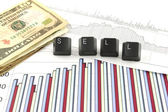 Biznes i wykresy z nas pieniądze i słowa Sprzedają? podkreślono w klawiaturze litery