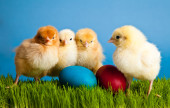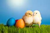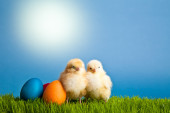 Pisanki i kurcząt na zielonej trawie na niebieskim tle