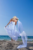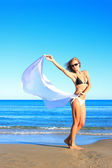 młoda kobieta w białym bikini gospodarstwa chusta na plaży