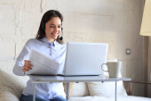 Wolny strzelec rozmawiający ze słuchawkami i konsultujący się z klientami z biura