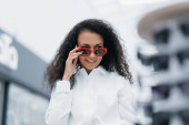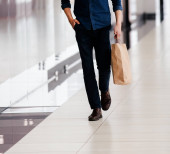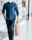 uśmiechnięta młoda kobieta spacerująca w centrum handlowym.