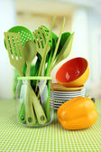 plastikowe naczynia w Pucharze na drewnianym stole