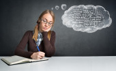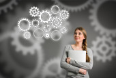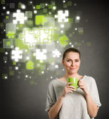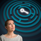 kobieta myśli patrząc na świecące kawałki układanki