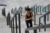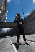 Widok z boku młodego afrykańskiego biegacza w słuchawce pracuje na schodach