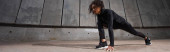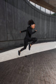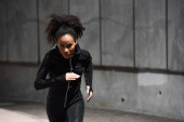 Młoda afrykańska sportowiec biegnie w pobliżu betonowej ściany z cieniem na miejskiej ulicy