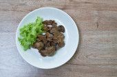 smażony plasterek mięsa wieprzowego i wątroby z czosnkiem para pieprz polewa pietruszkę na talerzu