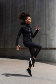 Afrykański biegacz w czarnej kurtce sportowej odwraca wzrok podczas biegania na świeżym powietrzu