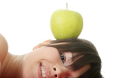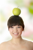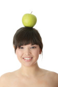 kaukaski piękno z zielonym jabłkiem. na białym tle