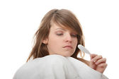 sanitarnych lub tampon - młoda kobieta Dokonywanie wyboru, na białym tle