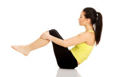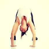 Młoda piękna kobieta w czasie fitness i ćwiczeń, na białym tle na białym tle