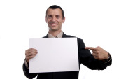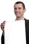 biznesmen z pusta karta biały