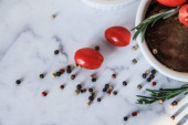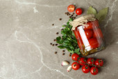 Pyszne świeże pomidory na szarym stole, płaskie układanki. Miejsce na tekst
