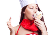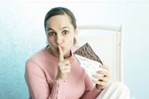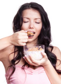 piękna młoda kobieta ukrywa się pod koc i jeść ciasteczka w łóżku