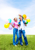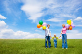 szczęśliwą rodziną skoki, balony, odkryty w letni dzień
