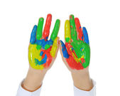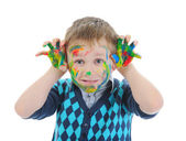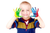 uśmiechnięty chłopiec z palmy malowane farbą. na białym tle