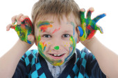 Zdjęcie "uśmiechnięty chłopiec z palmy malowane farbą. na białym tle" może być wykorzystywane do celów osobistych i komercyjnych zgodnie z warunkami zakupionej licencji Royalty-free. Obraz jest dostępny do pobrania w jakości wysokiej rozdzielczości do 5760x3840.