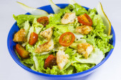 Sałatka z kurczaka z sałatą lodową i grzanką na drewnianym stole