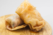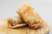 khinkali na białym talerzu posypane zieloną cebulą