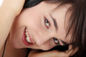 piękna nastolatka w zielonej sukni, słuchając muzyki z duże słuchawki, na białym tle