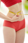 piękna młoda kobieta kaukaski pomiaru jej ciało z taśmy, na białym tle