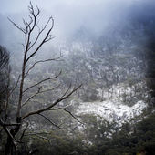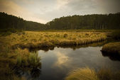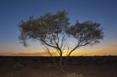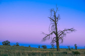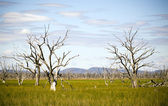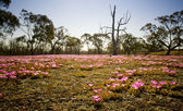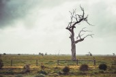 Klasyczny australijskiego krajobrazu wiejskiego o wschodzie słońca z drzewa spadł żucia w dziedzinie