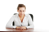 pracownik młody biuro kaukaski kobieta za biurkiem. na białym tle