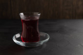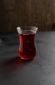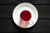 Czerwony kompot jagodowy stoi na talerzu na czarnym drewnianym stole w kuchni, sok owocowy, kompot w filiżance