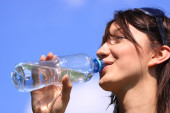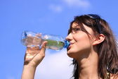 spragniony blond kobieta na pustyni napój z dużą butelkę wody.