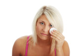 młoda kobieta za pomocą wacikiem, aby usunąć makijaż na białym tle