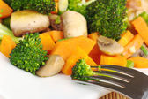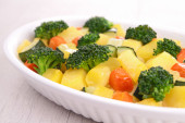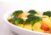Mango na świeże sałatka (brokuły, mango, marchew, sałata) w misce szkła (bardzo płytkiej głębi ostrości, skupić się na froncie mango)