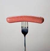 świeże kiełbasy na białe płytki z widelcem i nożem