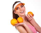 ujęcie to piękna młoda kobieta z owoców nakrycia głowy. conce żywności