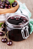 smaczne dżem z jagody w szklanym słoju na drewnianym stole