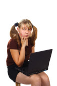 siedzi uczennica i notatnik. Studio strzelać na białym tle.