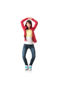 otwartymi ramionami dziewczyna w różowym podarte dżinsy. Studio strzelać na białym tle.