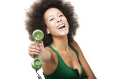 atrakcyjna uśmiechnięta kobieta z sercem na białym tle