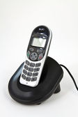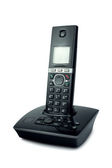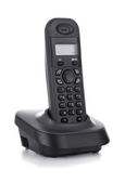 bezprzewodowy czarny telefon z podstawki na białym tle na biały deseń